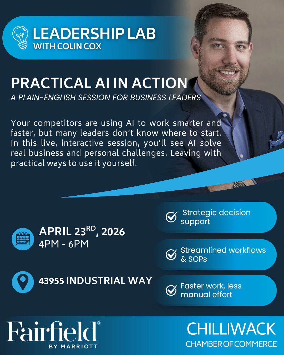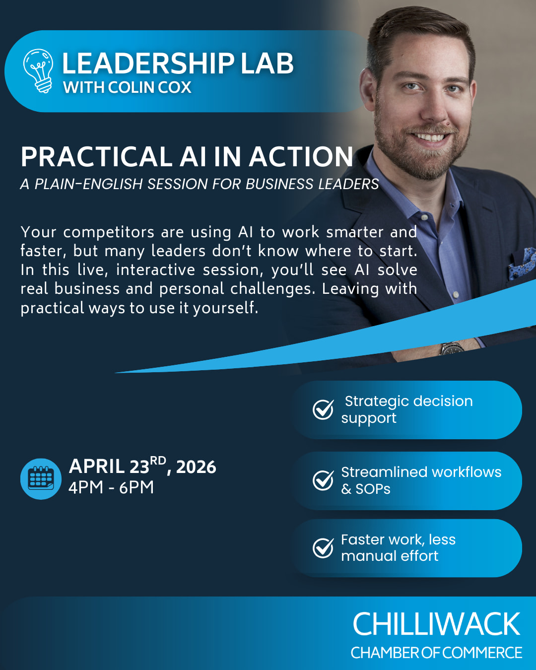 As part of the Chilliwack Chamber’s Leadership Lab, we’re excited to welcome Colin Cox. Join us for a live, interactive session where you’ll see AI in action solving real business and personal challenges and leave with practical ways to use it in your own work.